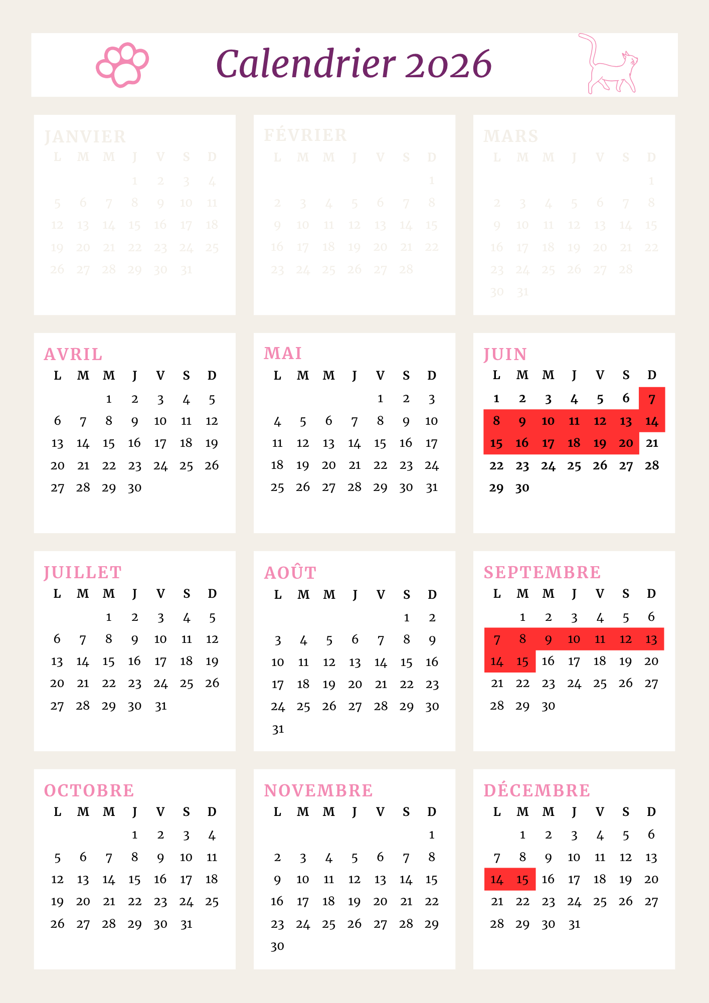 Calendrier 2026 Les dates "en rouge" = je suis indisponible ou en congés Les dates non surlignées = je suis dispo avec plaisir pour vos animaux !